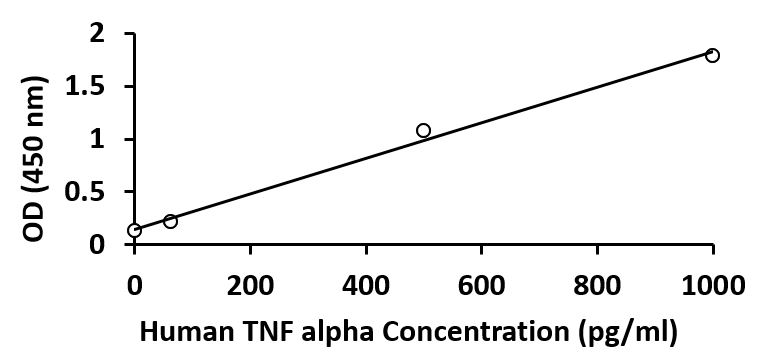 ARG83335 arigoPLEX® Human M1/M2 Cytokines Multiplex ELISA Kit (IL4, IL6, IL10, TNF alpha) results of a typical standard for Human TNF alpha run with optical density reading at 450 nm.