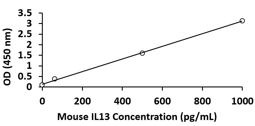 ARG83814 arigoPLEX® Mouse Allergy Multiplex ELISA Kit (IL4, IL5, IL13, IgE) results of a typical standard for Mouse IL13 run with optical density reading at 450 nm.
