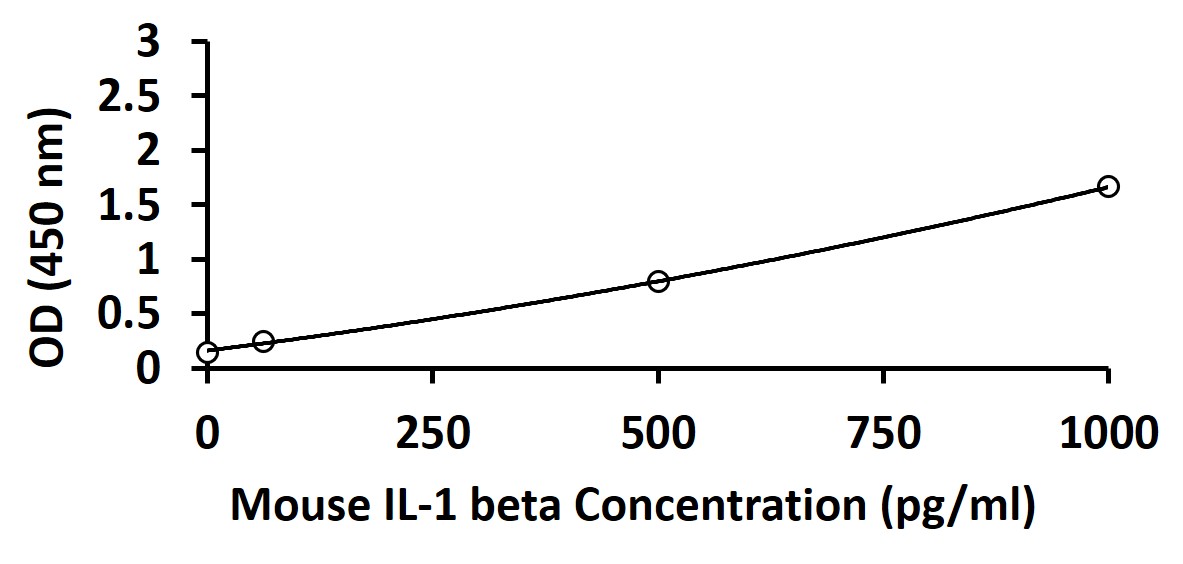 ARG82842 arigoPLEX® Mouse Proinflammatory Cytokine Multiplex ELISA Kit (IFN gamma, IL1 beta, IL6, TNF alpha) results of a typical standard for Mouse IL1 beta run with optical density reading at 450 nm.