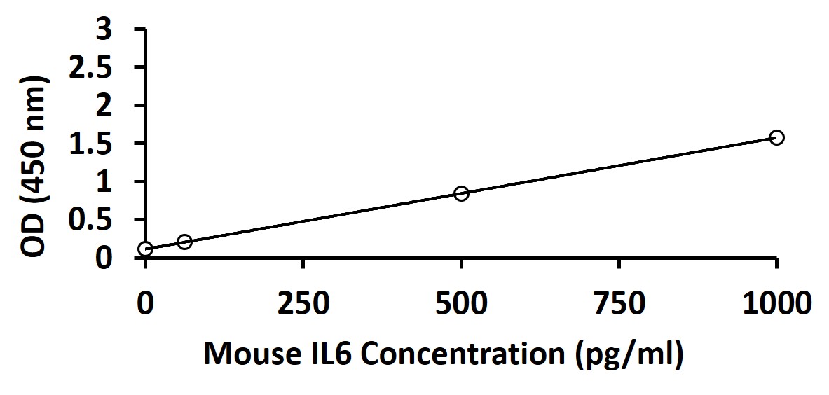 ARG82842 arigoPLEX® Mouse Proinflammatory Cytokine Multiplex ELISA Kit (IFN gamma, IL1 beta, IL6, TNF alpha) results of a typical standard for Mouse IL6 run with optical density reading at 450 nm.
