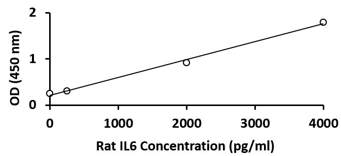ARG83356 arigoPLEX® Rat Fibrotic Marker Multiplex ELISA Kit (TGF beta1, PDGF BB, IL6, TNF alpha) results of a typical standard for Rat IL6 run with optical density reading at 450 nm.