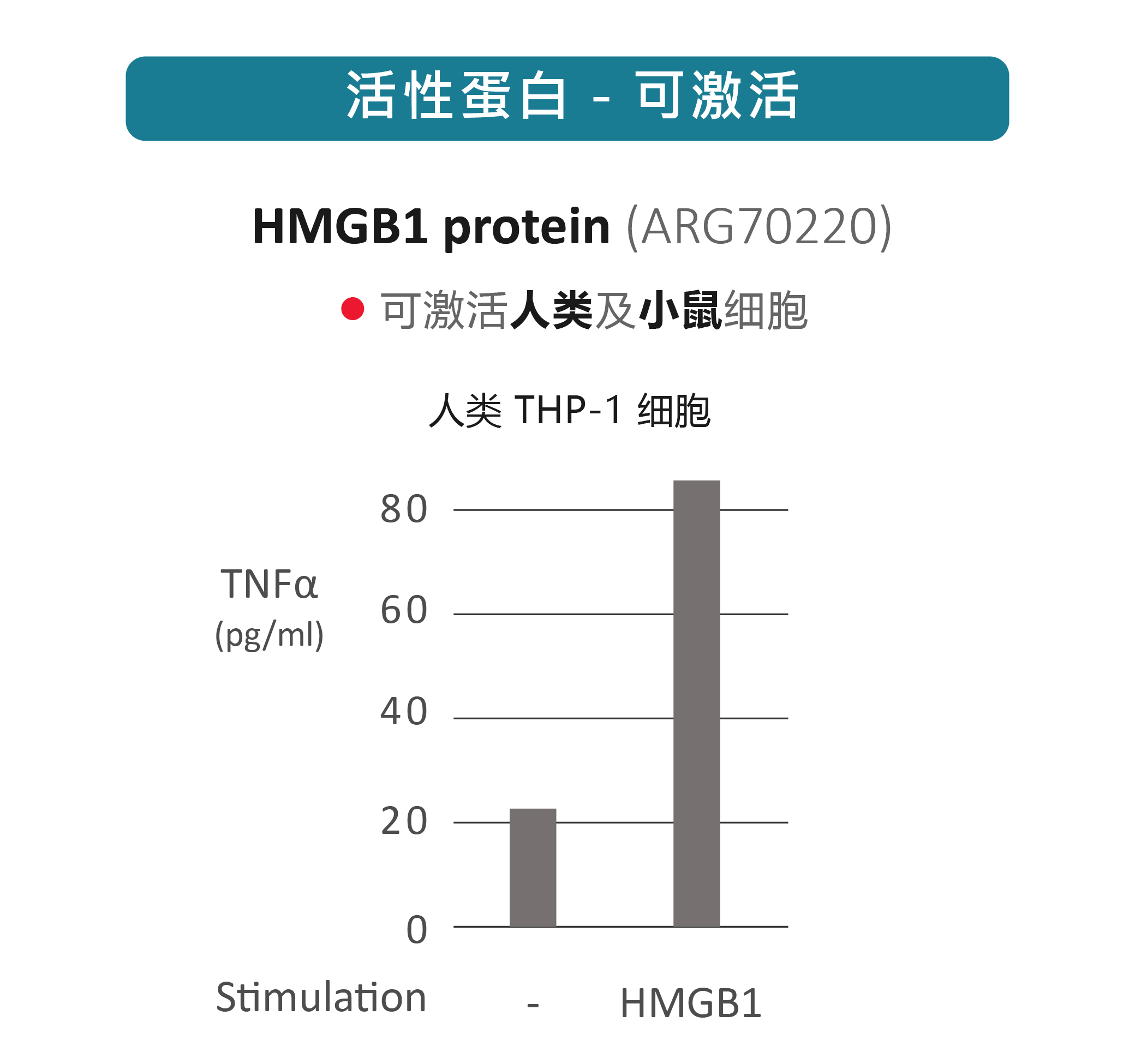 当 HMGB1 与单核细胞/巨噬细胞的表面受体 TLR2/4 结合会激活 NFkB 信号传导,从而促进炎性细胞因子表达,并驱动炎症反应。 |