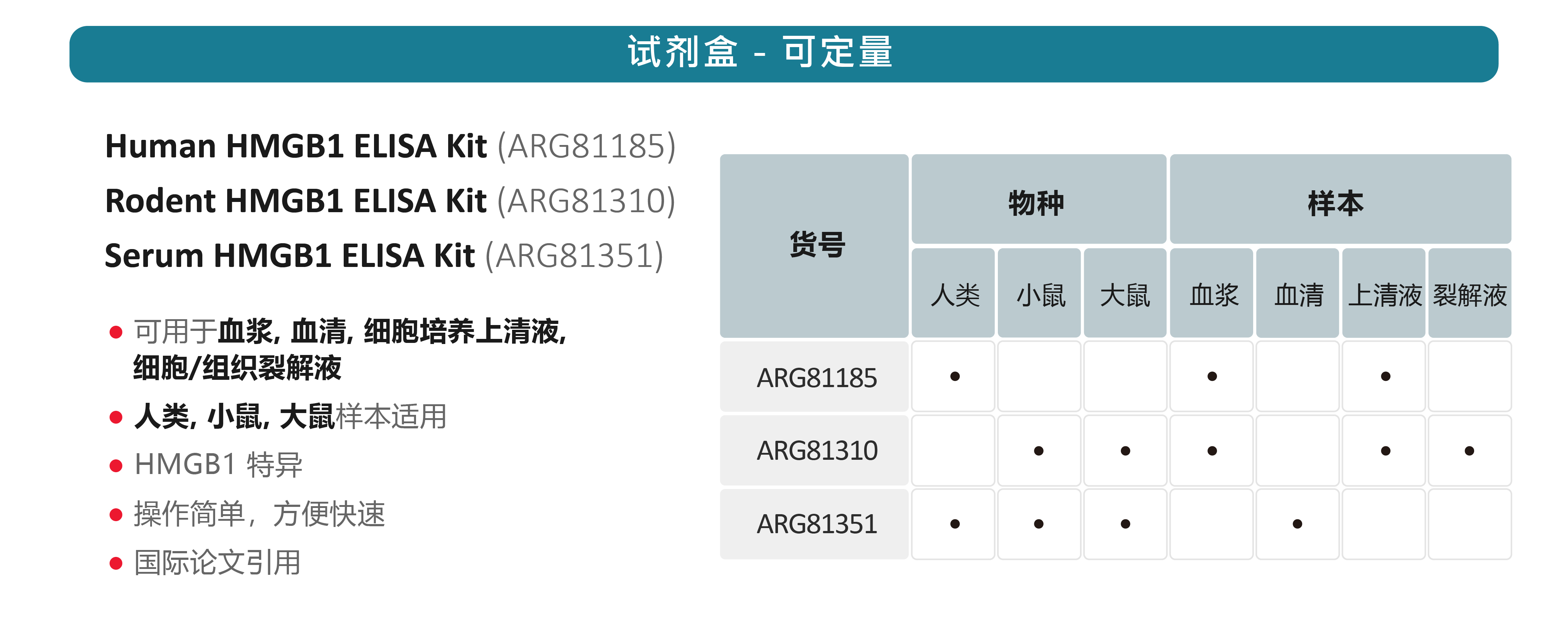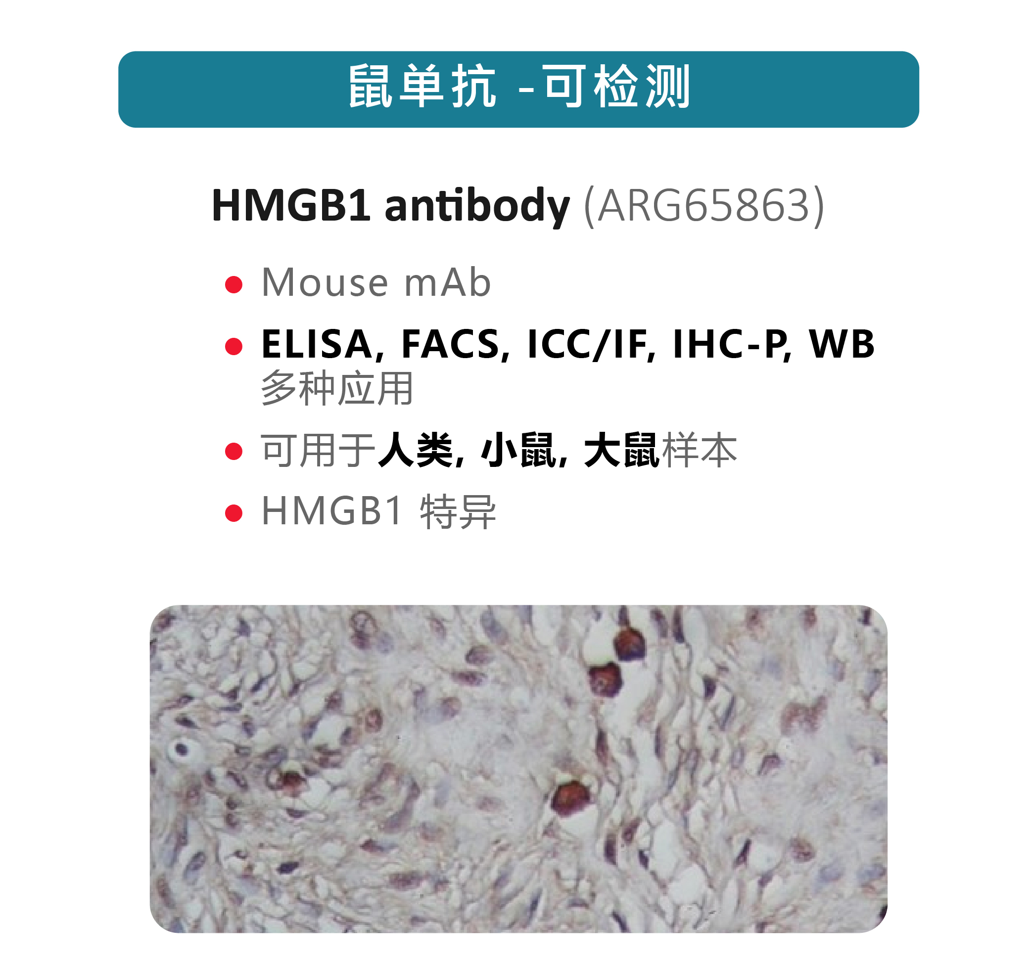 HMGB1 是一种多功能蛋白,在不同的细胞区室中具有多种作用。胞外 HMGB1 与炎症反应有关,其来源有二:从坏死细胞被动释出、由活化的免疫细胞主动分泌。被动释出的 HMGB1 是一种损伤相关分子模式 (DAMP),可募集白细胞触发炎症。主动分泌的 HMGB1 则可作细胞因子激活炎症反应。 |