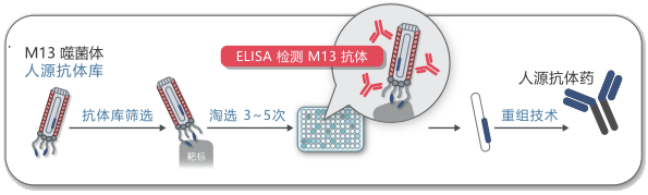 抗体药物淘选过程中,需检测 M13 所展示的抗体是否与靶标抗原有交互作用,检测方法是利用 ELISA 包被靶标抗原,再加入 M13 噬菌体抗体库,最后用 M13 抗体检测并筛选出抗体新药。高灵敏度 M13 抗体是成功筛出新药不可或缺的试剂。