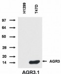 • Specificity: The clone AGR3.1 recognizes the epitope HETTDKNLS within the AGR3 (AG3) protein (19-20 kDa); a secreted cytoplasmic protein which can serve as a marker of carcinogenesis.